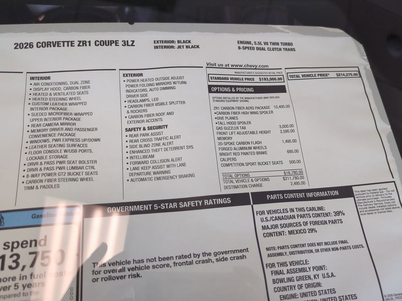 This Chevrolet Corvette has a dependable Gas V8 5.5L/ engine powering this Automatic transmission. ZR1 CARBON FIBER AERO PACKAGE visible carbon fiber, includes carbon fiber high-wing spoiler, dive planes, and tall hood spoiler, WHEELS, 20" X 10" (50.8 CM X 25.4 CM) FRONT AND 21" X 13" (53.3 CM X 33 CM) REAR 20-SPOKE, CARBON FLASH-PAINTED FORGED ALUMINUM, TRANSMISSION, 8-SPEED DUAL CLUTCH, INCLUDES MANUAL AND AUTO MODES (STD), SEATS, COMPETITION SPORT BUCKET, FRONT LIFT ADJUSTABLE HEIGHT WITH MEMORY includes (TR7) automatic headlamp leveling system.